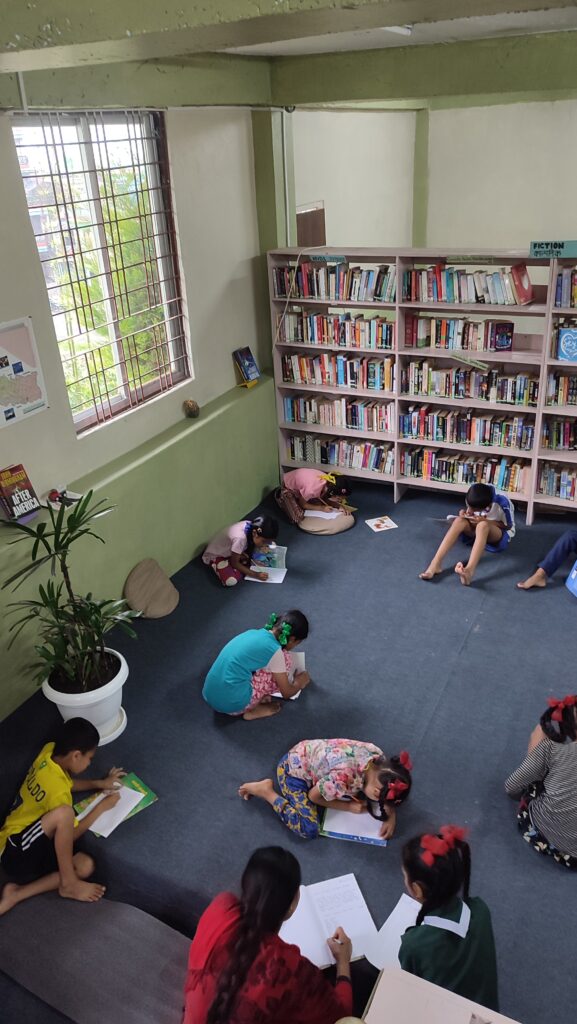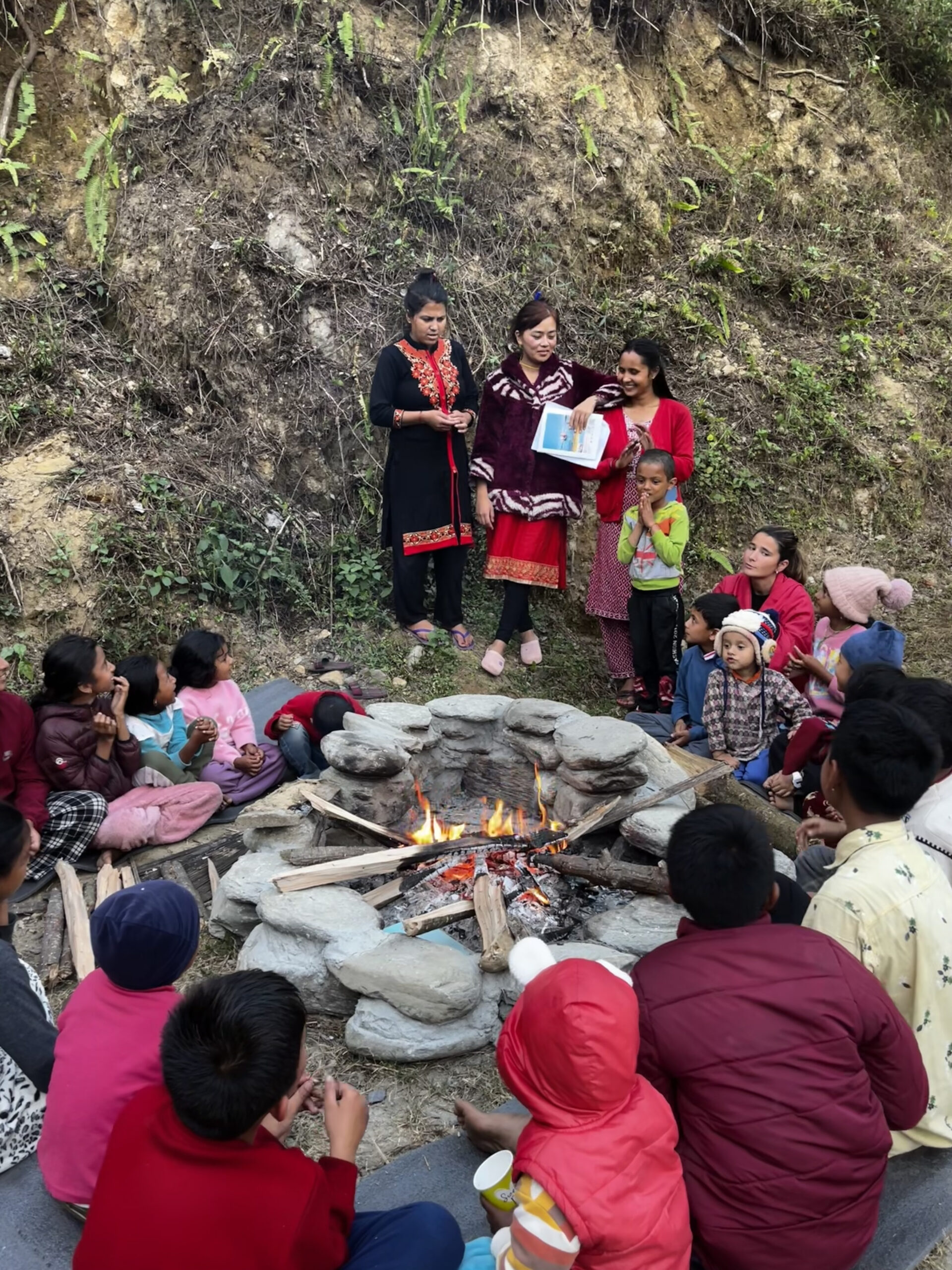 Ein weiterer erfolgreicher Workshop in unserer Bibliothek war das Geschichtenerzählen ums Feuer. Hier konnten die Kinder in gemütlicher Atmosphäre zusammenkommen, warmen Tee trinken und sich von den Bibliothekar:innen spannende Geschichten aus Bilderbüchern erzählen lassen. Zwischendrin gab es spontane Tanzeinlagen der kleinen Mutigen, was richtig süss war. Man merkte, wie sehr die Tanzkultur in Nepal schon von klein auf verankert ist.